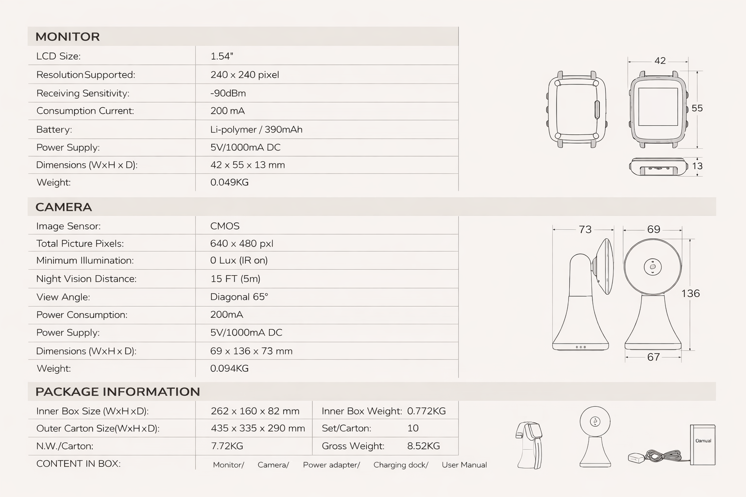 Wi-Fi-free baby monitor with live video, night vision, two-way audio, build-in lullabies and temperature monitoring. Designed for everyday use at home.
